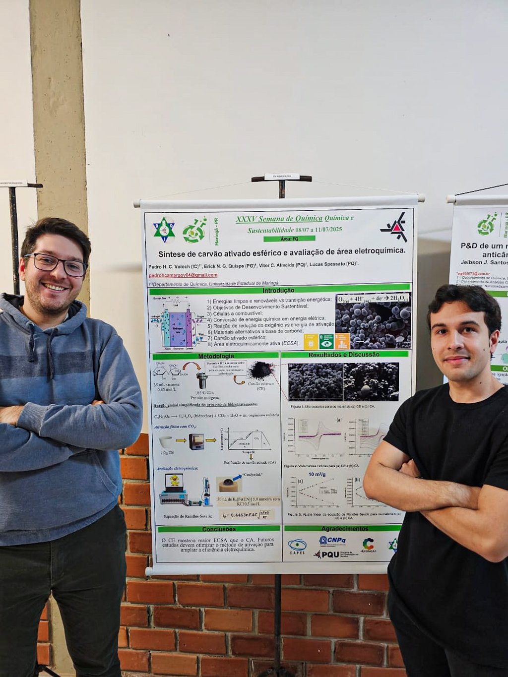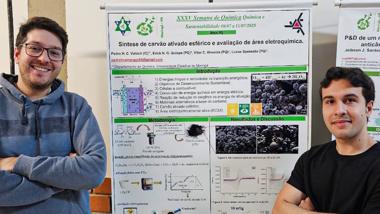 Prof. Lucas e seu aluno de Iniciação Científica, Pedro Voloch, marcaram presença na tradicional Semana de Química da UEM, apresentando pesquisas sobre materiais de carbono voltados à eletroquímica