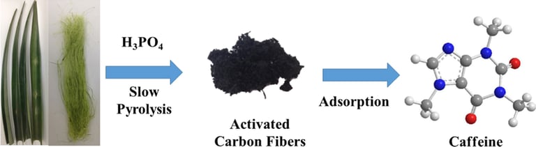 O presente trabalho relata a preparação de fibras de carbono ativadas (FCAs) a partir de folhas de abacaxi e sua aplicação na remoção de cafeína (CFN) de soluções aquosas. O procedimento de preparação foi realizado utilizando H₃PO₄ como agente ativador e pirólise lenta sob atmosfera de N₂. A caracterização dos materiais foi realizada por meio de isotermas de adsorção e dessorção de N₂ , microscopia eletrônica de varredura (MEV), análise termogravimétrica (TGA), espectroscopia de infravermelho com transformada de Fourier (FTIR), difração de raios X (DRX), espectroscopia Raman , titulação de Boehm e método de pH pzc . As FCAs apresentaram alto valor de área superficial BET ( SBET = 1031 m² g⁻¹ ), estrutura mesoporosa bem desenvolvida (volume de mesoporos de 1,27 cm³ g⁻¹ ) e poros com diâmetro médio (DM) de 5,87 nm. Adicionalmente, as ACFs apresentaram características de material fibroso com predominância de grupos ácidos em sua superfície. Estudos de adsorção indicaram que os modelos cinéticos de pseudo-segunda ordem e de isoterma de Langmuir foram os que melhor se ajustaram aos dados experimentais. A capacidade de adsorção em monocamada foi de 155,50 mg g⁻¹ . Estudos termodinâmicos revelaram que o processo de adsorção é espontâneo, exotérmico e ocorre preferencialmente por fisissorção . As folhas de abacaxi são um precursor eficiente para a preparação de ACFs, que foram aplicadas com sucesso como material adsorvente para a remoção de cafeína de soluções aquosas.