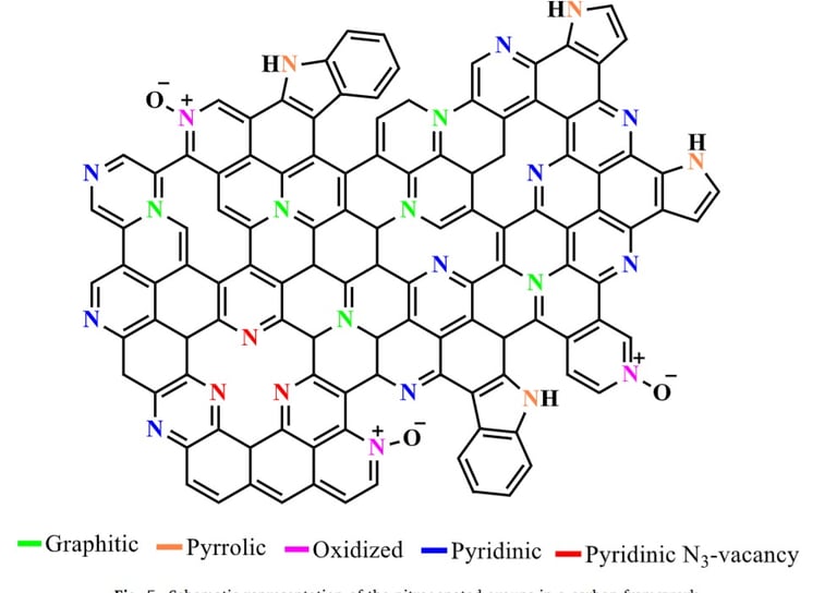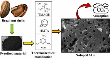 Carvões ativados dopados com nitrogênio (CANs) foram produzidos a partir de cascas de castanha-do-pará (CCP) utilizando um procedimento simultâneo de ativação com KOH e dopagem com nitrogênio usando melamina (MM), hexametilenotetramina (HMTA) ou hidróxido de tetrametilamônio (TMAOH). Os resultados de fisissorção de N₂ demonstraram que os materiais apresentam valores de área superficial BET variando de 1755 a 2562 m² g⁻¹ . A análise XPS evidenciou que todos os CANs apresentaram composição superficial relativa de nitrogênio de 6,40% a 17,1%. Os espectros Raman e as imagens de MEV comprovaram que a dopagem com nitrogênio causou danos significativos à superfície dos materiais. Os resultados de adsorção de CO₂ em baixa pressão demonstraram que os valores de qₑ variaram de 4,16 a 5,30 mmol g⁻¹ . Dentre os NACs, o material AC 2MM apresentou o menor valor de S BET (1755 m² g⁻¹ ) , o maior teor de N na superfície (17,1%) e os maioresde qe de CO₂ (5,30 mmol g⁻¹ a 273 K e 1,0 bar, e 22,60 mmol g⁻¹ a 298 K e 45 bar). Assim, os resultados evidenciam que a dopagem com N tende a contribuir mais para a adsorção de CO₂ do que valores extremamente altos de área superficial .