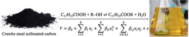 O catalisador à base de carbono sulfonado, obtido a partir da farinha de crambe, foi aplicado com sucesso na reação de esterificação do ácido oleico . As ferramentas quimiométricas permitiram avaliar a importância dos parâmetros: tempo, dosagem do catalisador e razão molar etanol/ácido oleico, bem como suas interações no rendimento de conversão do ácido oleico via reação de esterificação. Os resultados mostraram que a razão molar teve a maior influência no rendimento de conversão. A análise das superfícies de resposta e da função de desejabilidade indicou que é possível converter cerca de 75% do ácido oleico em ésteres nas seguintes condições experimentais: tempo de 2 h, dosagem do catalisador de 11 % em massa e razão molar etanol/ácido oleico de 18:1 ( v/m ). A partir da otimização dos fatores, foi possível obter um bom rendimento de conversão do ácido oleico aplicando condições semelhantes ou inferiores às relatadas na literatura. Após quatro ciclos de uso, o catalisador ainda apresentou um rendimento de conversão de 29%. A diminuição do rendimento da esterificação foi avaliada por meio de espectros FTIR, que corroboram a perda de grupos sulfônicos após cada ciclo de reutilização, concomitantemente com a diminuição do rendimento.