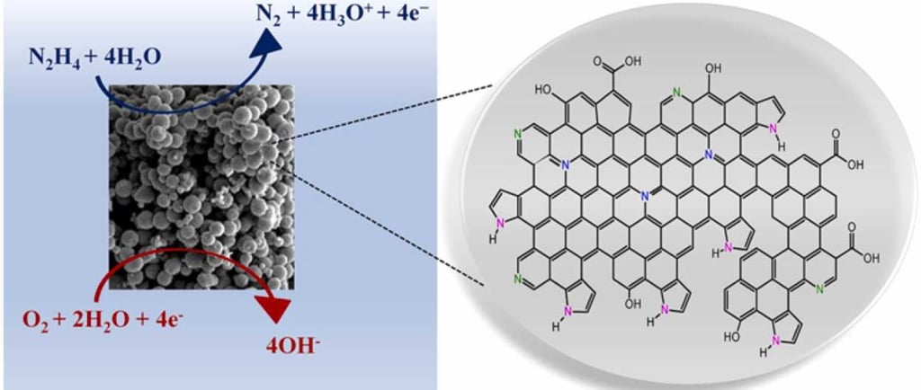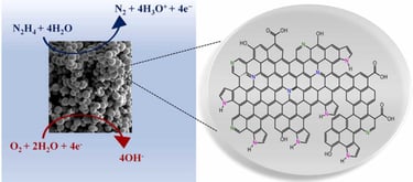 Considerando que o estado da arte em dispositivos de conversão de energia está focado no desenvolvimento de eletrocatalisadores eficientes e de baixo custo , materiais de carbono livres de metais nobres têm sido estudados como substitutos promissores para catalisadores comerciais à base de platina. Dada a importância da sustentabilidade e da minimização da geração de resíduos, propomos não adotar uma metodologia exclusiva para a preparação do novo catalisador , mas sim utilizar um carvão ativado esférico saturado com moléculas de azul de metileno (SAC sat ) após o processo de adsorção . Um breve tratamento térmico do SAC sat em atmosfera de N₂ a 635 °C por 30 min foi realizado para incorporar átomos de N na rede de carbono, criando defeitos e sítios ativos para melhorar a condutividade eletrônica. O SAC dopado com N (N-SAC) apresentou área superficial BET de 661 m² g⁻¹ e 1,1 % de nitrogênio em sua composição elementar , distribuído em grupos pirrólicos (51,0%), piridínicos (29,2%) e grafíticos (19,8%). O desempenho eletrocatalítico do SAC puro e do N-SAC foi testado nas reações de oxidação da hidrazina e redução do oxigênio . O N-SAC promoveu a oxidação total da hidrazina e a redução total do oxigênio, visto que o número calculado de elétrons transferidos para essas reações foi de aproximadamente quatro. Além disso, as respostas eletroquímicas do N-SAC como eletrocatalisador bifuncional foram comparáveis ​​ou até mesmo superiores às de outros catalisadores contendo metais nobres.