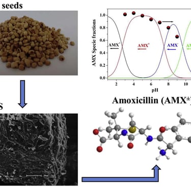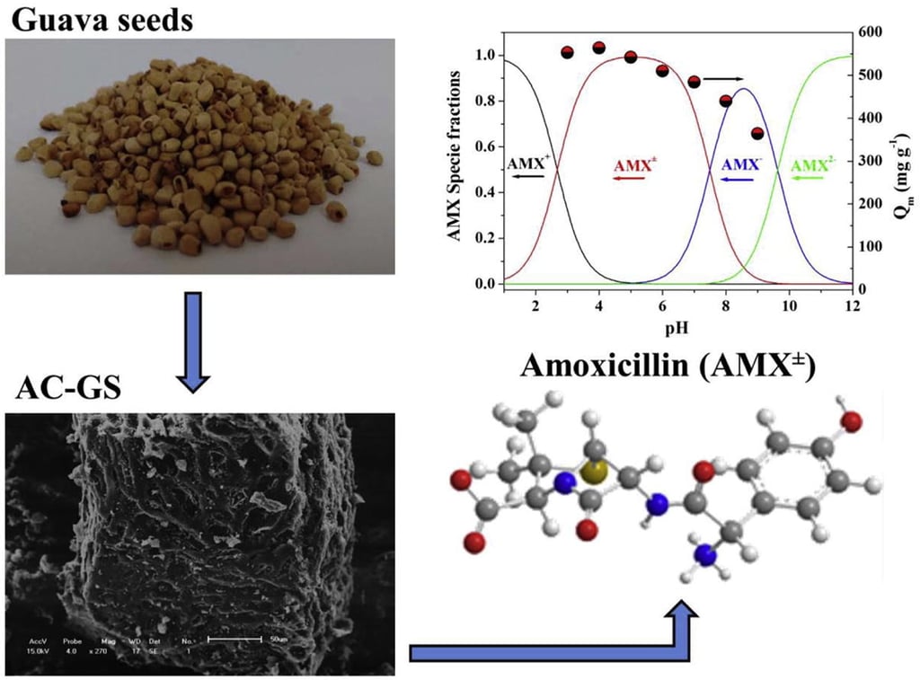 Neste trabalho, relatamos a preparação e a caracterização de carvão ativado com NaOH de alta área superficial, produzido a partir de sementes de goiaba (AC-GS), e sua aplicação na adsorção de amoxicilina (AMX). O AC-GS foi totalmente caracterizado por meio de isotermas de adsorção e dessorção de N₂ , microscopia eletrônica de varredura (MEV), análise termogravimétrica (TG), espectroscopia de infravermelho com transformada de Fourier (FTIR), titulação de Boehm e pH PZC. Além disso, foram avaliados os parâmetros cinéticos, de equilíbrio e termodinâmicos da adsorção de AMX no AC-GS. O AC-GS apresentou área superficial BET de 2573,6 m² g⁻¹ e características microporosas (85%), com diâmetro médio de poros de 1,96 nm, adequadas para a adsorção de AMX. Os dados experimentais de adsorção foram modelados utilizando diversos modelos cinéticos (pseudo-primeira ordem, pseudo-segunda ordem e Elovich) e isotérmicos (Freundlich, Langmuir, Redlich-Peterson e Dubinin-Radushkevich), que sugeriram que a adsorção de AMX em AC-GS ocorre predominantemente por quimissorção, apresentando uma capacidade máxima de adsorção em monocamada de 570,48 mg g⁻¹ ( pH = 4,0; T = 25 °C), valor que se destaca em comparação com diversos adsorventes encontrados na literatura. Adicionalmente, os parâmetros termodinâmicos revelaram a espontaneidade da adsorção de AMX (ΔG ° = −1,915 kJ mol⁻¹ a 298 K) e sua característica endotérmica (ΔH ° = 21,33 kJ mol⁻¹ ) , evidenciando a alta eficiência do AC-GS para a adsorção de AMX e seu grande potencial para a remoção de poluentes orgânicos.