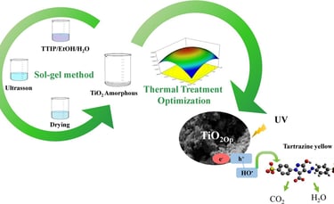 O presente trabalho relata o uso de ferramentas quimiométricas para investigar o efeito do tratamento térmico na síntese de TiO₂ pelo método sol-gel e sua fotoatividade na fotodegradação do corante amarelo tartrazina (TY). Os parâmetros térmicos, como temperatura, taxa de aquecimento e tempo de aquecimento, foram avaliados a partir da constante aparente (kapp) determinada pela cinética de fotodegradação do corante tartrazina, que foi utilizada como resposta para um planejamento composto central rotacional (CCR). A avaliação dos efeitos dos parâmetros na resposta e a otimização do processo foram realizadas por meio da metodologia de superfície de resposta (RSM). Os resultados mostraram que três parâmetros têm influência significativa na resposta e que não há efeitos de interação entre eles. Além disso, o TiO₂ que apresentou a melhor fotoatividade (TiO₂Op ) foi obtido nas seguintes condições térmicas: temperatura de 527 °C, taxa de aquecimento de 6 °C min⁻¹ e tempo de aquecimento de 177 min. As técnicas de análise mostraram mudanças significativas nas características texturais, morfológicas, químicas, cristalográficas e de estabilidade térmica do TiO₂Op , quando comparado ao TiO₂ sintetizado com a menor atividade fotocatalítica. O TiO₂Op apresentou energia de banda proibida de 3,04 eV e parâmetros cinéticos de fotodegradação de TY de kapp 6,26 × 10⁻³ min⁻¹ e t 1/2 110,7 min.