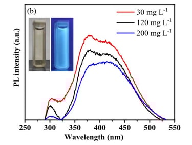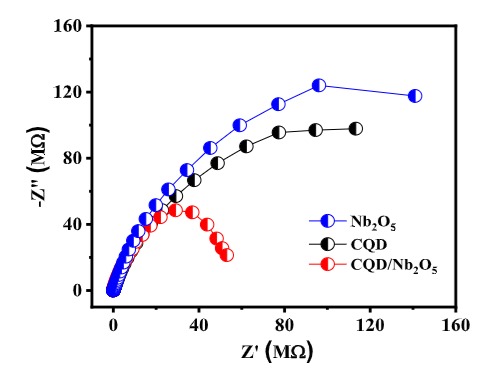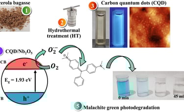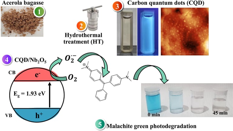 Pontos quânticos de carbono (CQD) foram empregados como dopantes para aumentar a eficiência fotocatalítica do Nb₂O₅ , diminuindo aenergia do gap de banda e prolongando a vida útil do éxciton fotogerado por meio do aumento da condutividade. Difração de raios X (DRX), porosimetria de N₂ , microscopia eletrônica de varredura (MEV), espectroscopia de impedância eletroquímica (EIE), espectroscopia fotoacústica (PAS), espectroscopia de fotoelétrons de raios X (XPS), espalhamento dinâmico de luz (DLS), potencial zeta e microscopia de força atômica (AFM) foram utilizados para caracterizar as nanoestruturas sintetizadas. Os resíduos do processamento da acerola foram convertidos em CQD com tamanho médio de 2,56 nm, conforme confirmado por AFM e pelo alto rendimento quântico de fluorescência de 43,32%. Os resultados da fisissorção de N₂ mostraram que os CQDs foram depositados na superfície do Nb₂O₅, reduzindo a área superficial específica de 122 ± 2,0 para 29 ± 1,3 m² g⁻¹ . O desempenho fotocatalítico do CQD/Nb₂O₅ foi superior ao dos materiais de controle sob irradiação de luz UV-visível, visto que houve uma diminuição na energia do gap de banda (Eg) de 2,78 para 1,93 eV. Essa diminuição em Eg levou a um aumento significativo na constante de velocidade aparente (kapp) do corante MG de 1,90 × 10⁻³ s⁻¹ para 42,2 × 10⁻³ s⁻¹, demonstrando que a presença de CQDs pode separar efetivamente os portadores de carga fotogerados, como observado pelo aumento na condutividade mostrado pelo diagrama de Nyquist.